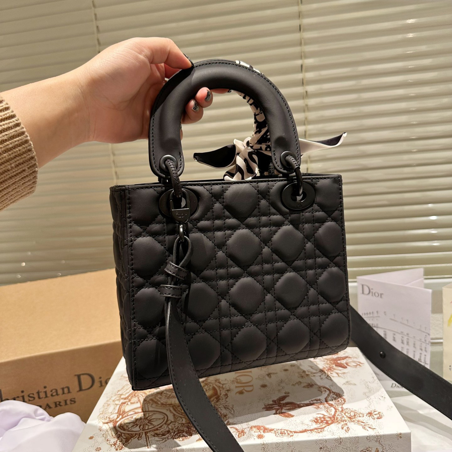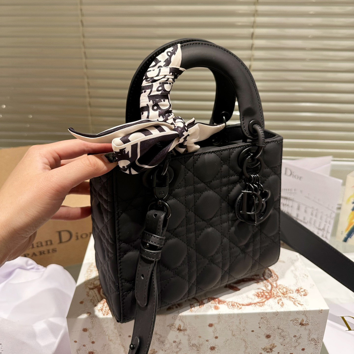 The Lady Dior My ABCDior bag epitomizes Dior's deep vision of elegance and beauty. Crafted from matte black calfskin leather, it features striking quilted details in a cannage pattern topstitching, a chic and timeless design. The tonal metal D.I.O.R. charm adds a touch of movement to the exquisite silhouette. The small size has a unique design and the strap can be decorated with a badge to highlight your personality. It can be carried by hand or across the body.