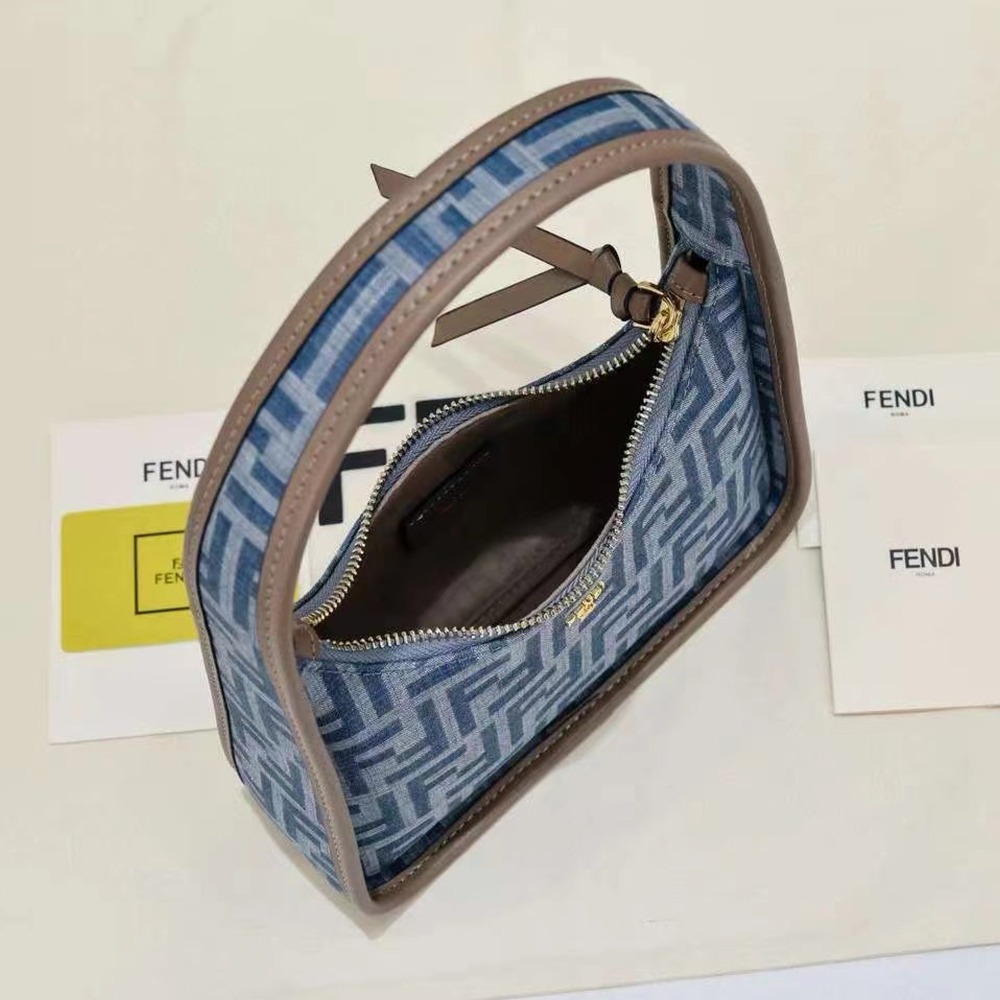 Compact yet spacious Fendessence hobo bag in denim-style light blue fabric with FF motif. Trimmed with beige leather. Zip closure with long, knotted leather pull.