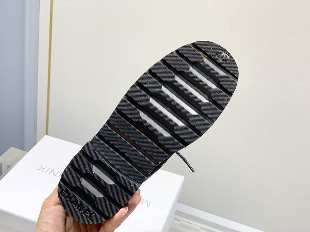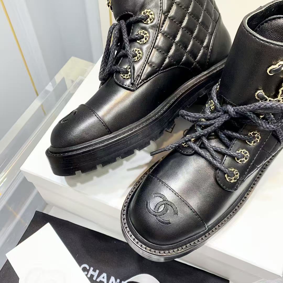 • Chanel Shiny Qulited Lace Up Combat Boots Black