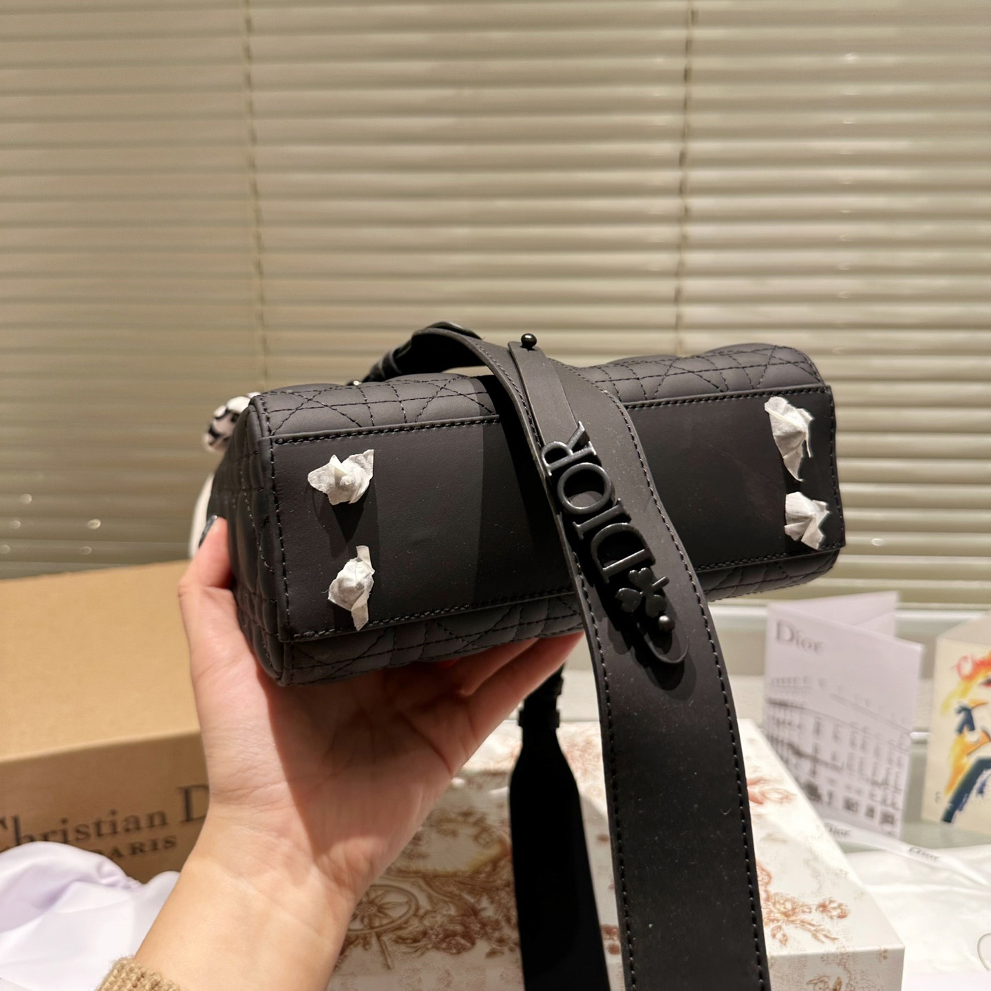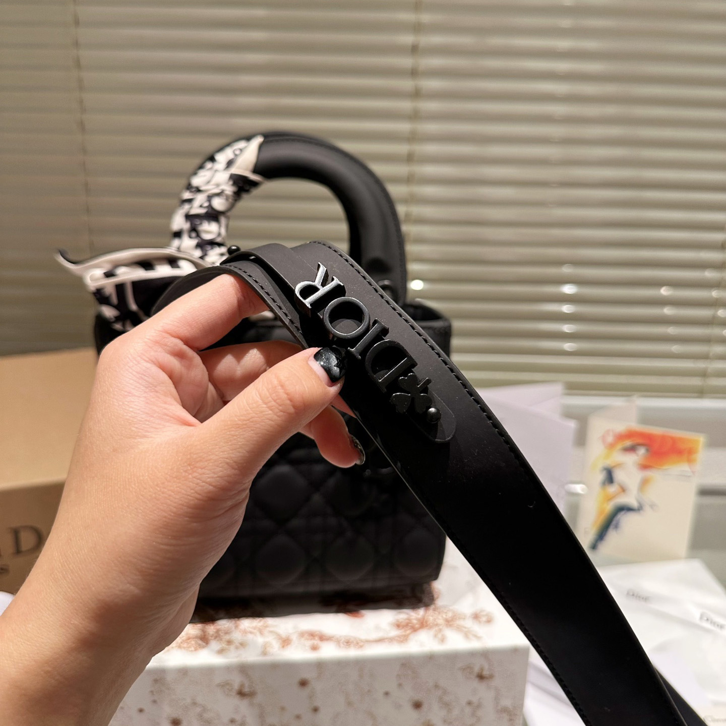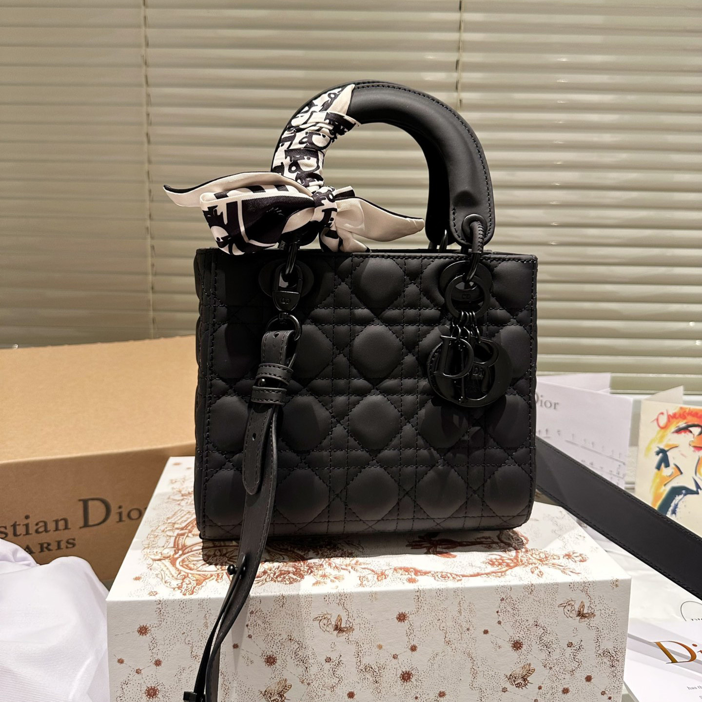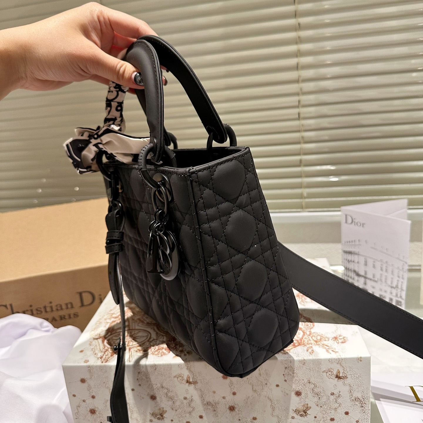 The Lady Dior My ABCDior bag epitomizes Dior's deep vision of elegance and beauty. Crafted from matte black calfskin leather, it features striking quilted details in a cannage pattern topstitching, a chic and timeless design. The tonal metal D.I.O.R. charm adds a touch of movement to the exquisite silhouette. The small size has a unique design and the strap can be decorated with a badge to highlight your personality. It can be carried by hand or across the body.