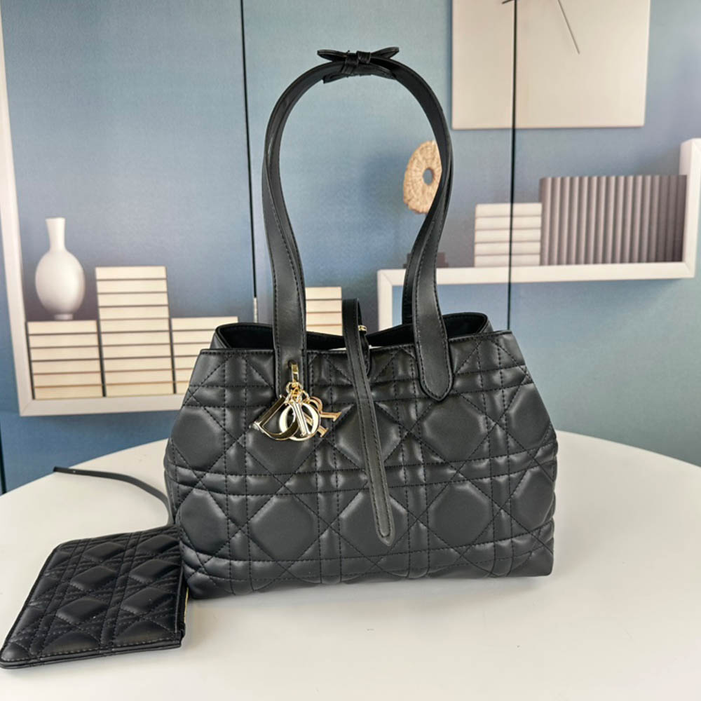 The Dior Toujours bag made its debut at the Dior Spring/Summer 2023 ready-to-wear collection show, and its casual and practical design is unique. Crafted from black calfskin leather, it is decorated with oversized cannage stitching and has a spacious interior with small pockets to neatly store all your daily necessities. It has a slim leather lace-up closure to safely store all your items, and a CD Lock letter D knob-style clasp that can be adjusted on both sides to enhance the style. The medium style has leather handles with adjustable details, which can be carried by hand or on the shoulder.