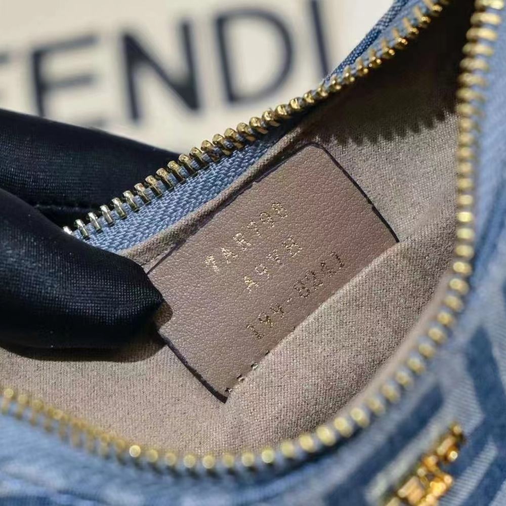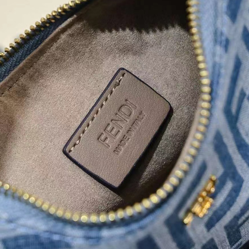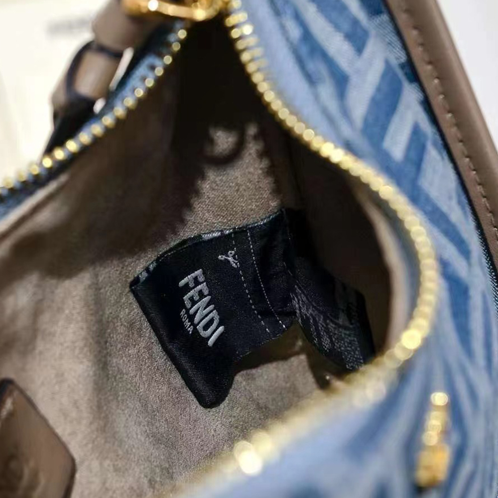 Compact yet spacious Fendessence hobo bag in denim-style light blue fabric with FF motif. Trimmed with beige leather. Zip closure with long, knotted leather pull.