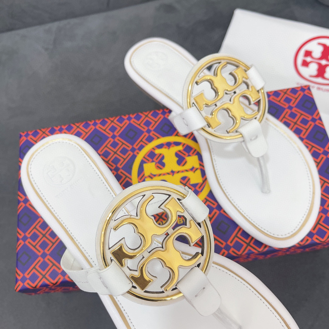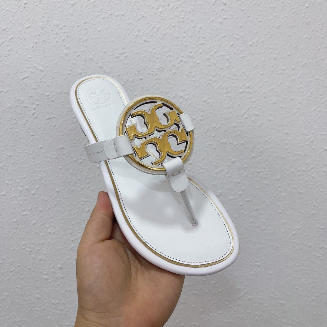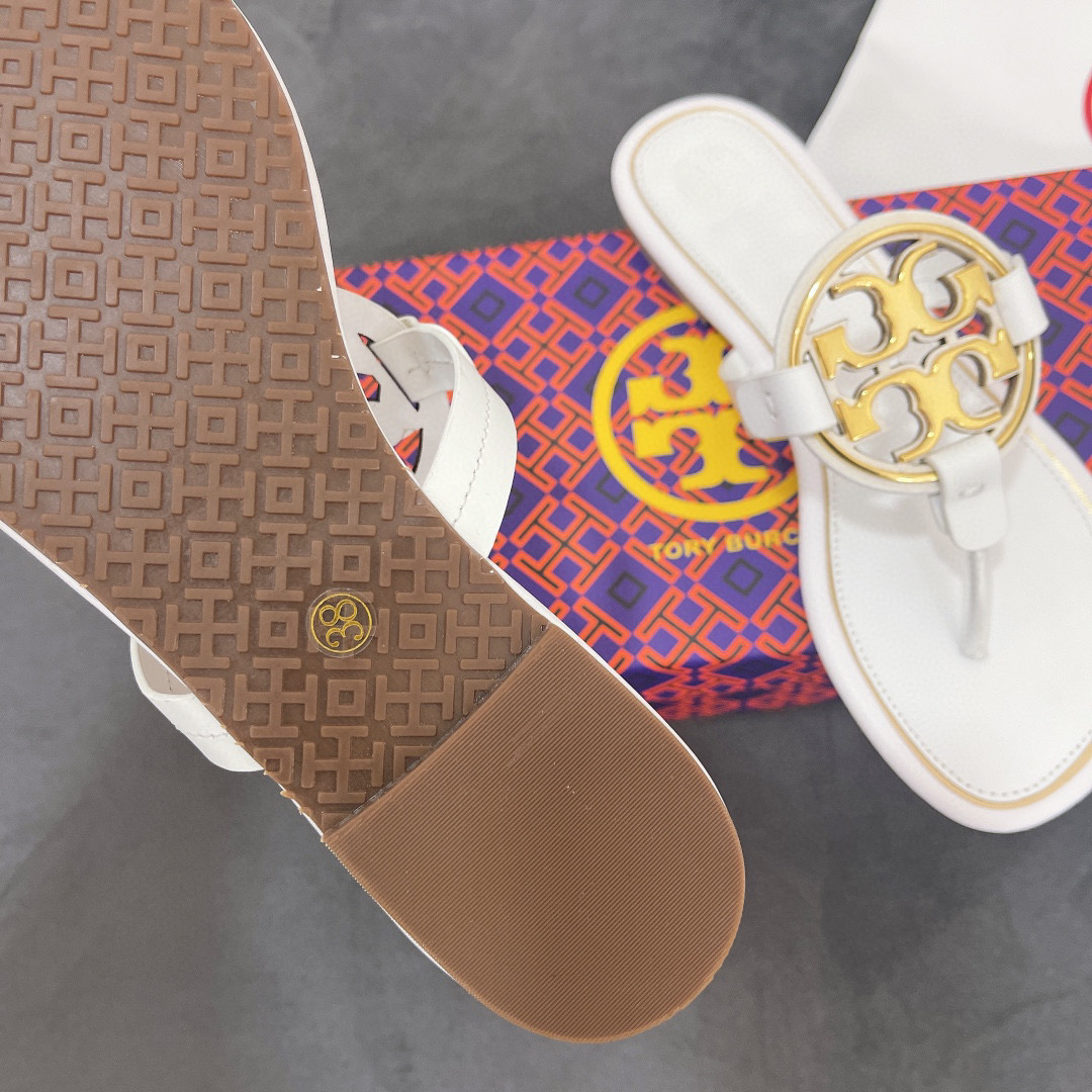 • Tory Burch Leather Metal Double T Logo Flip-flops Sandals Slide
