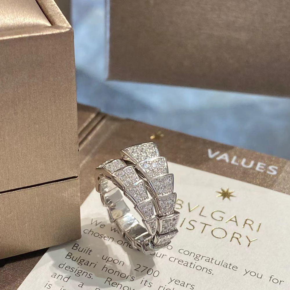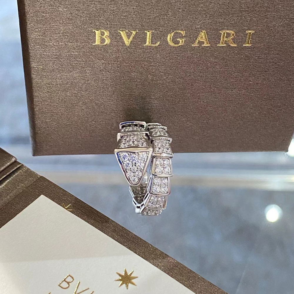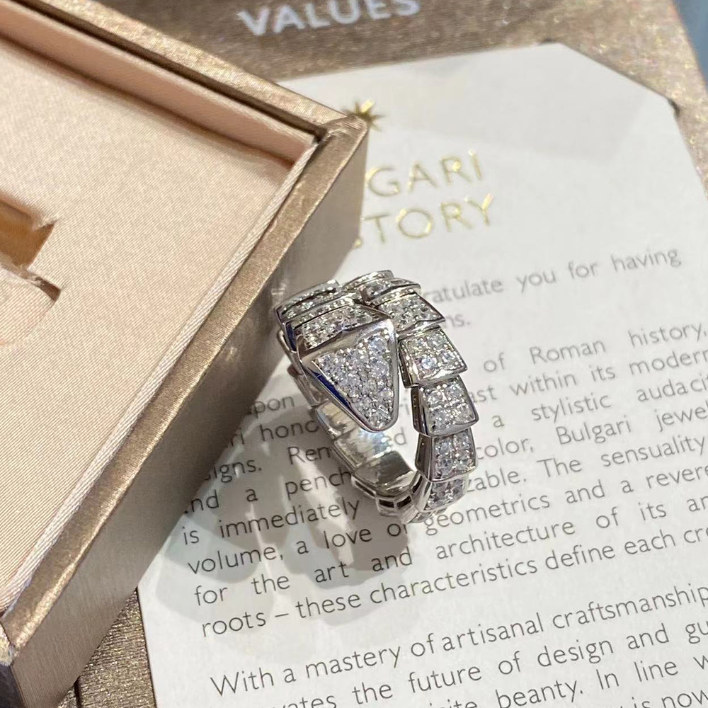 With its signature blend of pure aesthetics, enveloping shapes and charismatic flair, the Serpenti Viper 18 kt white gold ring with full pavé diamonds is an essential interpretation of Bvlgari’s icon of endless metamorphosis. Capturing the powerful and ever-evolving nature of the mythical serpent, the magnetic jewellery creation inspires us to embrace change as a source of strength and self-confidence. Easy to mix and match, the ring offers endless styling options, embodying the collection’s versatile spirit.
